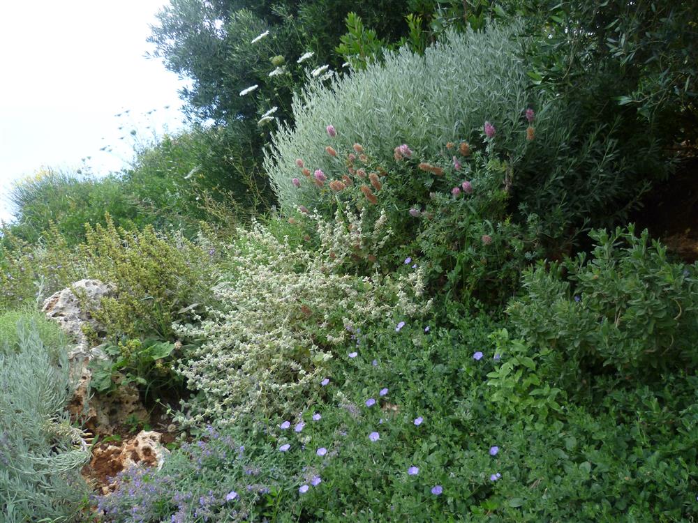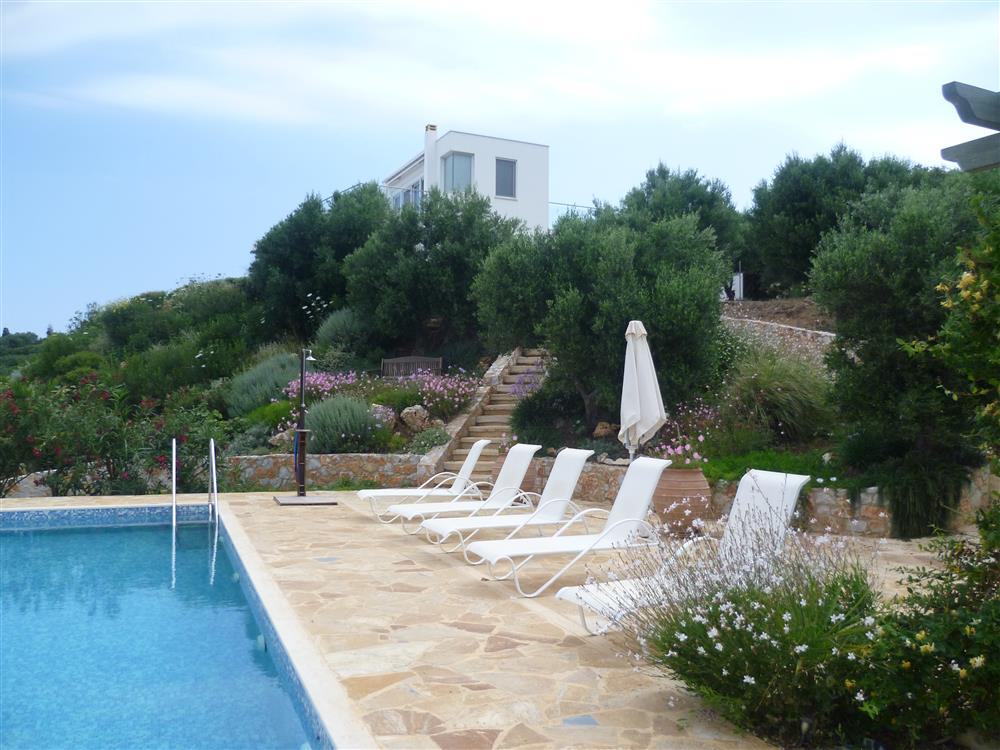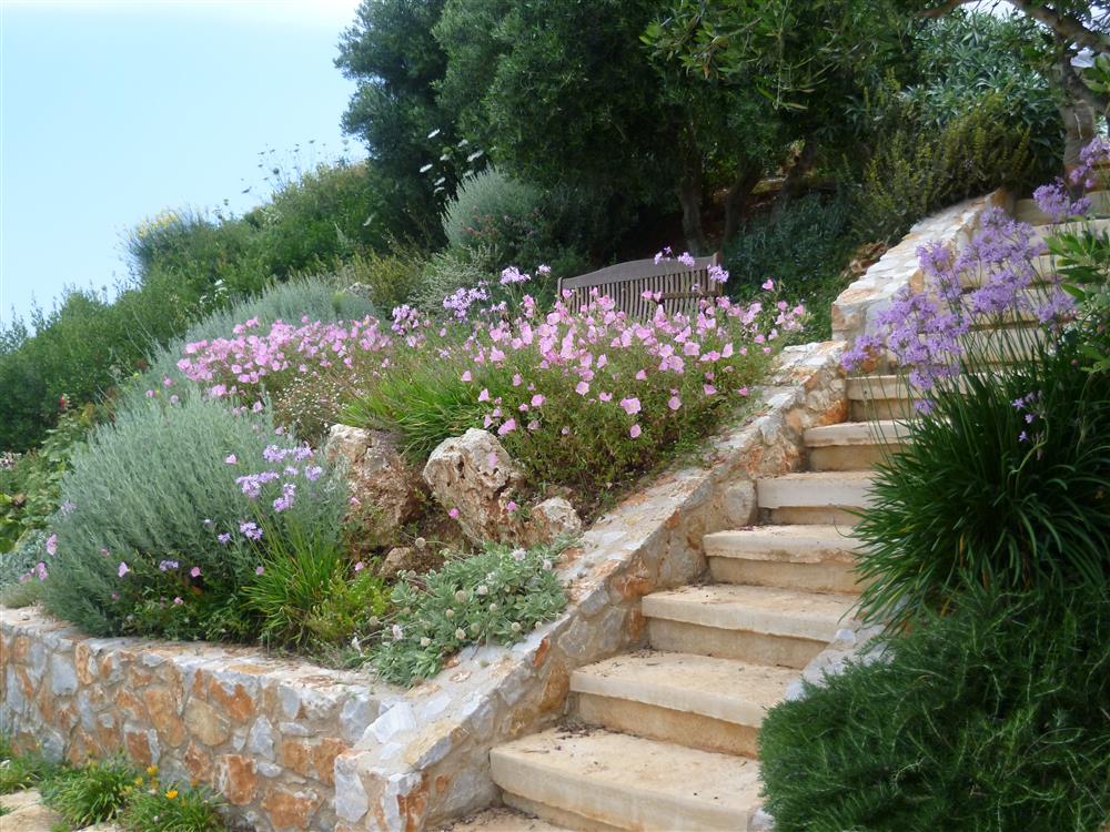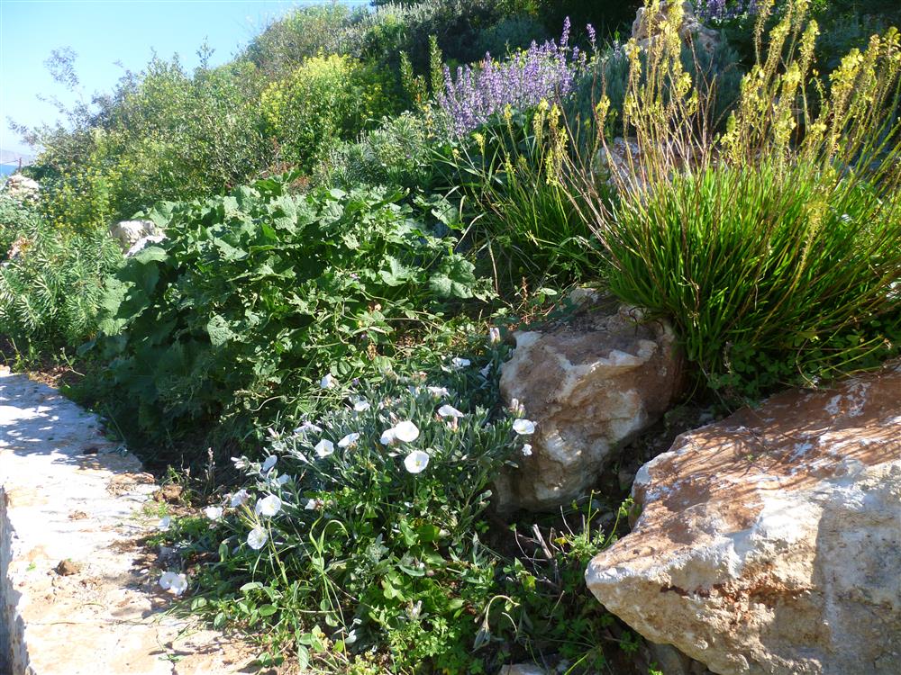BASICS: A villa on the hilltop facing the bay of Souda deep in local greenery and herbal scents. This garden is located ~ 30-45m above sea level and is just a small walk away from the sea. Each room of the modern villa has a sea view – the sea and the villa became one. (spectacular view). And so did the garden become one with the villa and the surrounding nature.