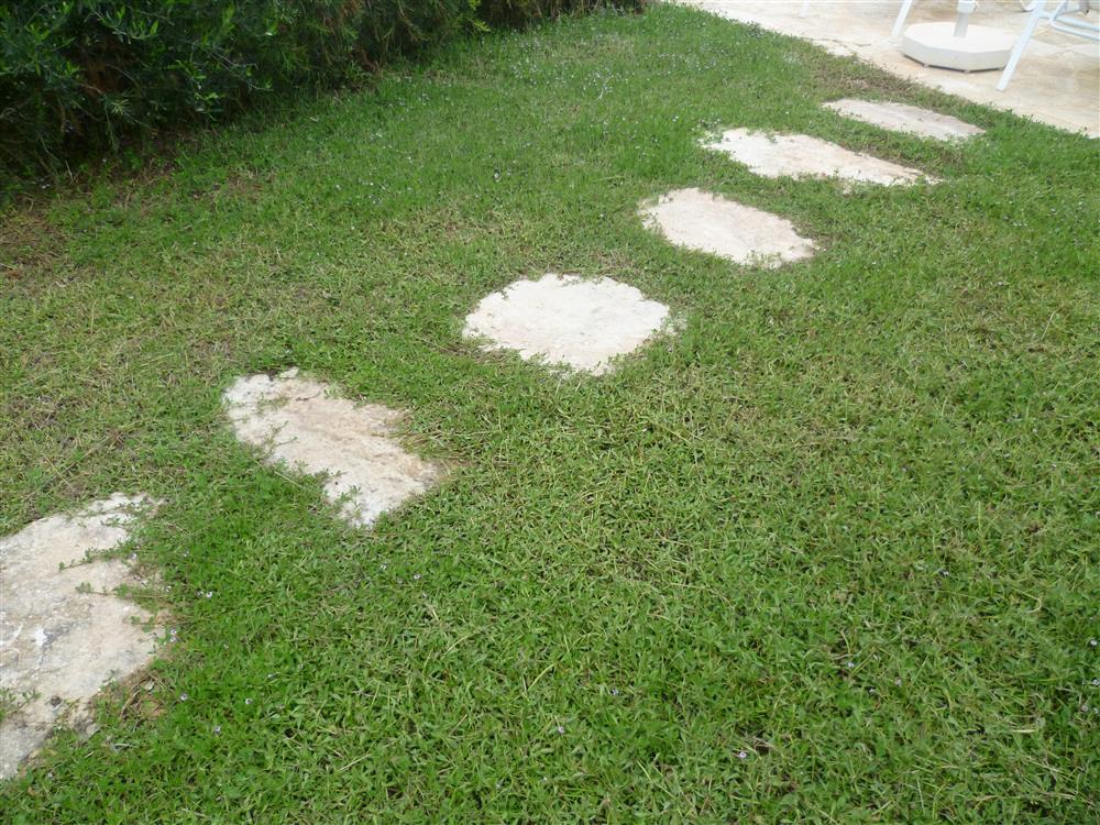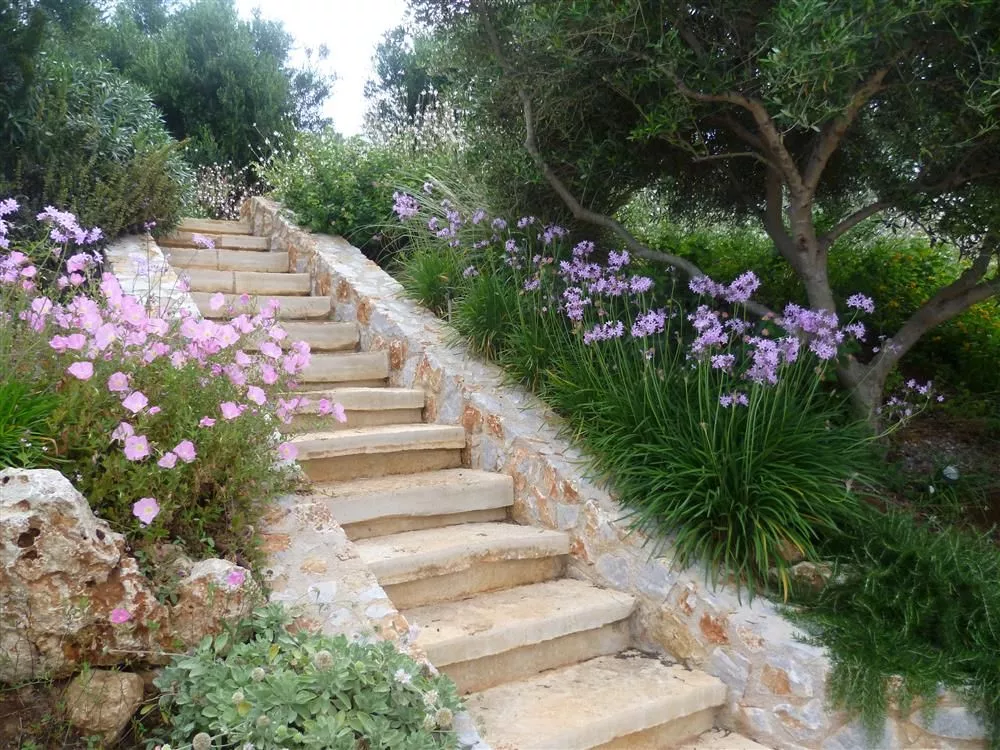 Their fragrant scent wraps body and mind in a relaxing pleasant atmosphere and brings a sense of well-being. Pink and white hedges and flowers escort the visitor from the main entrance gate to the house. An area with Mediterranean lawn attracts for relaxation at the pool and a seating area inside the rockery at the high slope invites for Mediterranean summer dreams.